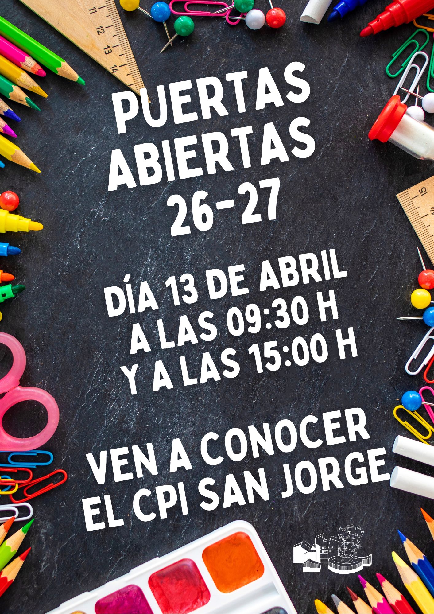 El próximo 13 de abril, a las 09:30 h y a las 15:00 h, abrimos las puertas del CPI San Jorge para todas las familias que quieren conocer nuestro proyecto educativo. No es necesaria inscripción ni reserva.